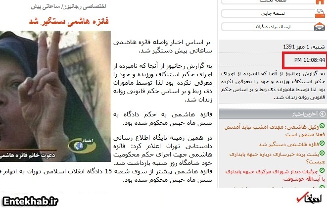 به گزارش خبرنگار «انتخاب» ، سایت دولتی رجانیوز نخستین رسانه ای بود که خبر بازداشت فائزه هاشمی را مطرح کرد و نکته جالب آنکه این خبر در ساعت 11 و هشت دقیقه منتشر شده است، یعنی دقیقاً 8 دقیقه (حدودی) پس از بازداشت فائزه!