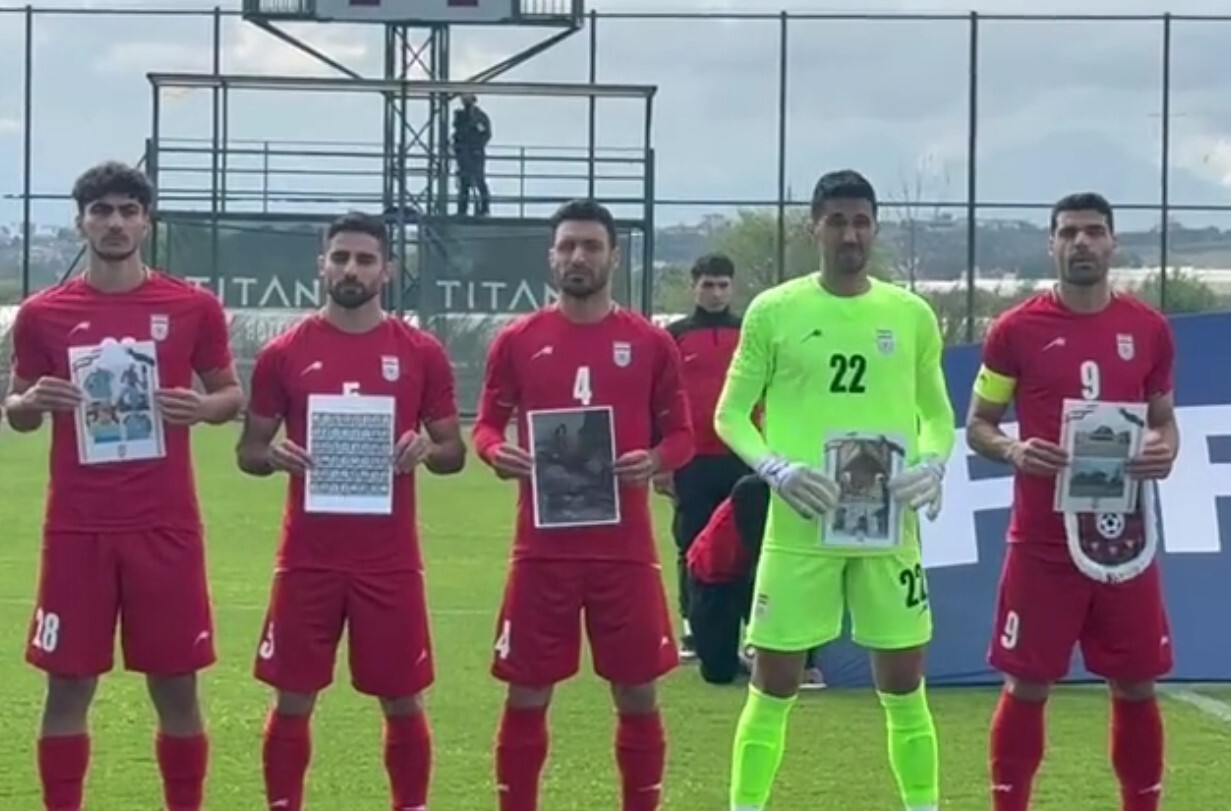 ملی پوشان و اعضای کادر تیم ملی پیش از دیدار برابر کاستاریکا، تصاویر شهدای ایرانی، شهدای ناو دنا، اماکن ورزشی و ابنیه تاریخی تخریب شده، نیروهای هلال احمر و آتش نشان در جنگ تحمیلی در دستان خود گرفتند.