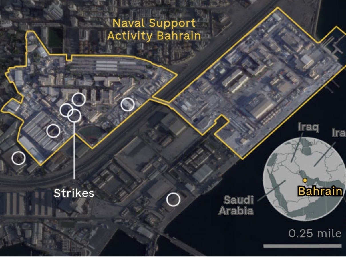 خبر قابل توجه رادیو ملی آمریکا: پس از حملات ایران، ۱۵۰۰ ملوان نیروی دریایی آمریکا از پایگاه خود در بحرین، به آمریکا منتقل شده‌اند / از سایر پایگاه‌های نظامی آمریکا در منطقه نیز تخلیه انجام شده / تصاویر ماهواره‌ای نشان می‌دهد که حداقل به هفت ساختمان در داخل و اطراف پایگاه آمریکایی در بحرین آسیب وارد شده
